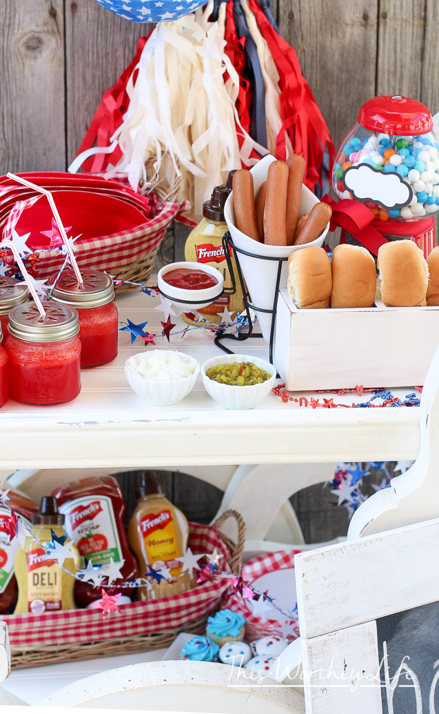 At the bottom of the cart, I added additional condiments, mini cupcakes, paper products, and a few patriotic accessories. I love how this all came together!