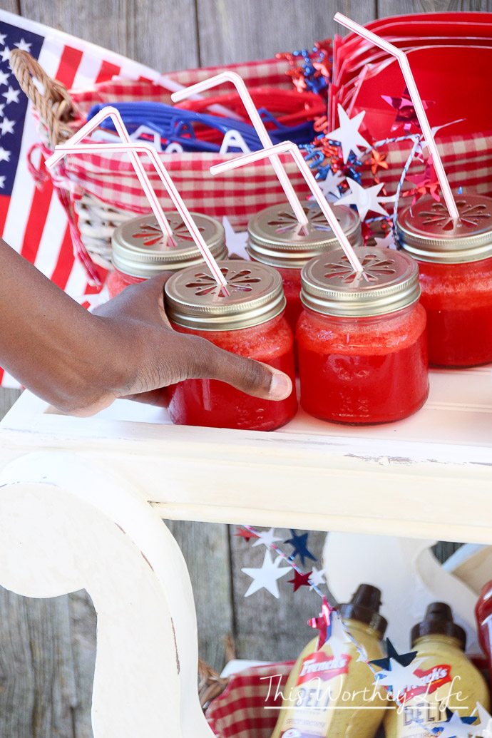 The Frozen Cherry Limeade was also a big hit with the boys. And of course, I had to put them into mason glasses since that’s also a staple in all things Americana. I picked them up from Tuesday Morning (home decor store).