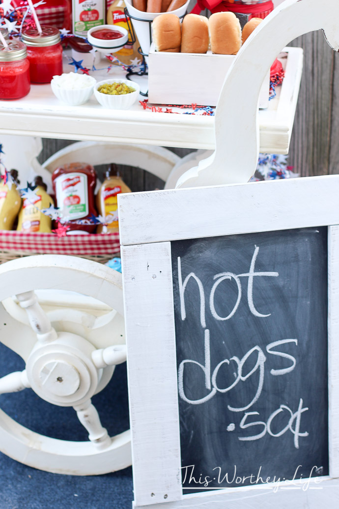 I also added a chalkboard off to the side and wrote “hot dogs .50 cents” on it. If you don’t have a chalkboard sign, you can skip this option, or use a white cardboard sign.