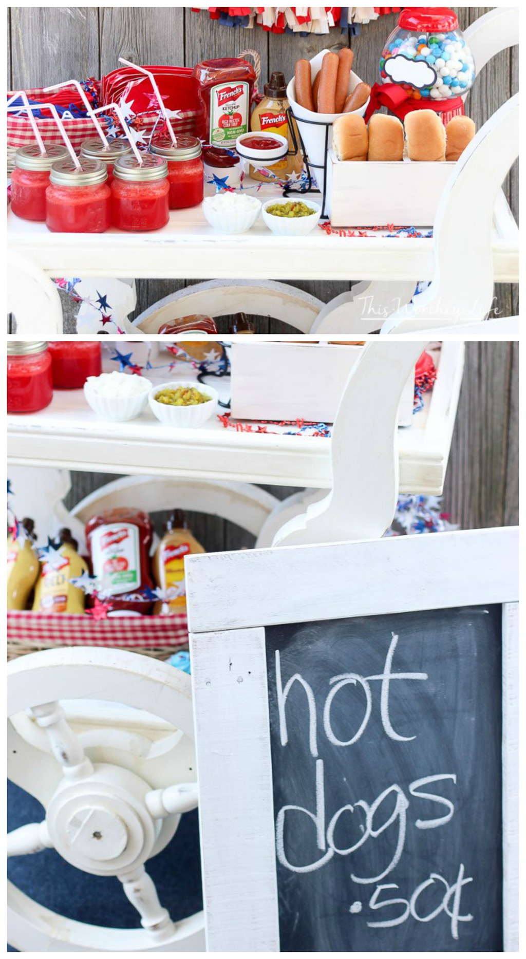 Get creative for your 4th of July party by adding an Americana Hot Dog Stand. This hot dog cart idea can easily be used for birthday parties, weddings, or fun summer parties! Get the details below on how to create your own DIY Hot Dog Stand.