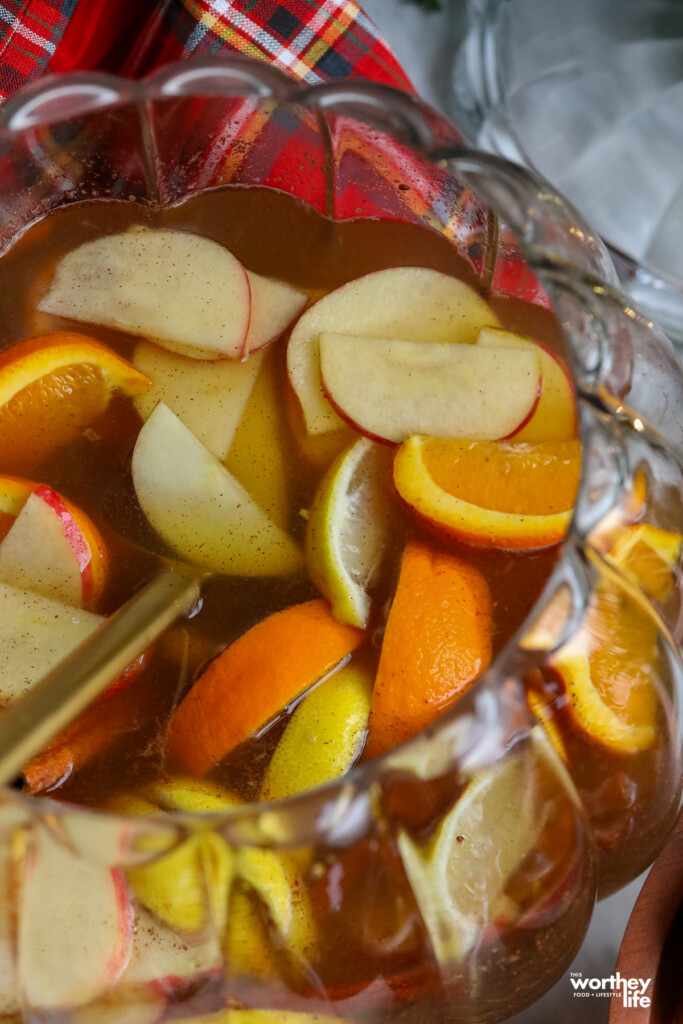 Oranges & Lemons. Adding slices of citrus fruit like oranges and lemons is a great way to make our apple pie sangria punch shine! Those citrus flavors pair well with the apple slices and look stunning in a punch bowl.