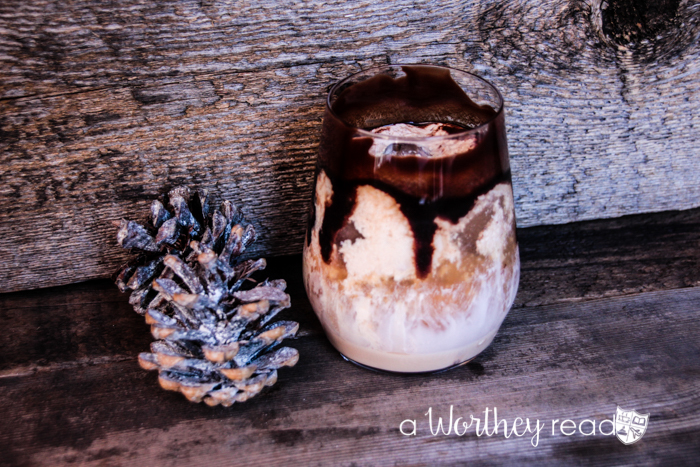 - Drizzle dark chocolate syrup on the inside of the glass.