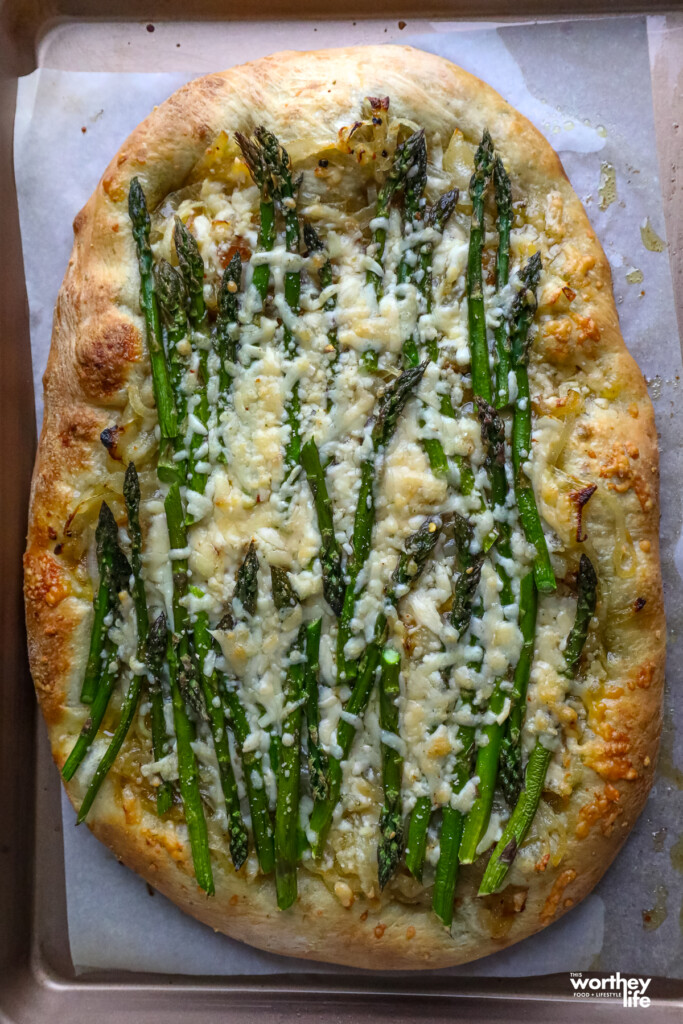 To save time, you can prep the onions and asparagus beforehand (even a day before). Just sauté the thsautéons and store them in the fridge until you’re ready to assemble and bake the flatbread.