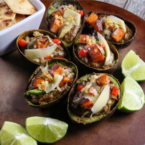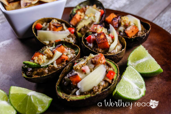 - Preheat oven to 350. Chop, slice, mince, and scoop avocados, sweet potatoes, red bell pepper, and garlic ahead of time, this will save tons of time when you are ready to put these bad babies together. Save the empty avocado skins because you'll need them to add the avocado mixture. Scrub, clean and chop sweet potato into 1" cubes, add one tablespoon of EVOO to a skillet over medium-high heat and brown potatoes, reduce to low heat and cook into a the tines of a fork can easily pierce the flesh of potatoes, about 15 - 20 minutes. Salt and pepper to taste. Keep warm until ready to use.