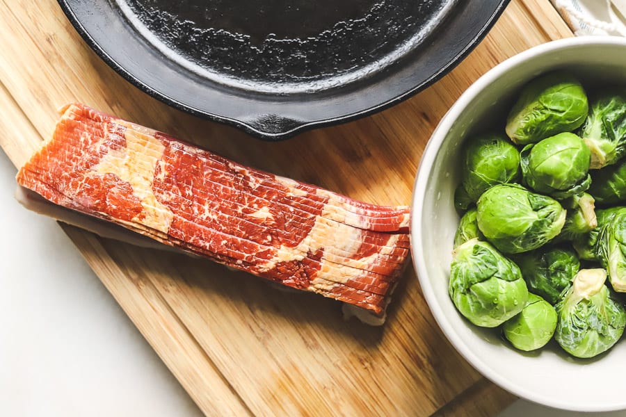 - Wrap each Brussels sprout with a strip of thick-cut bacon.