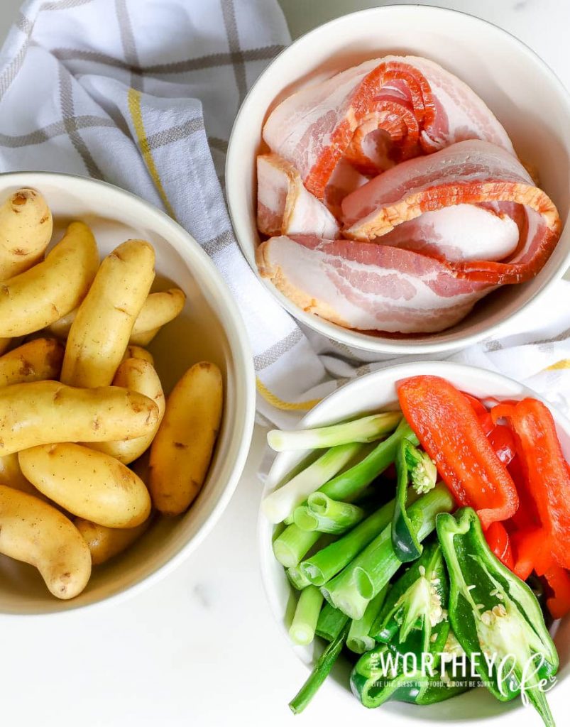 - Wrap four of the fingerling potatoes with green onion and a single strip of thick-cut bacon, four with Ancho peppers and bacon, and the remaining four with red bell peppers and bacon.