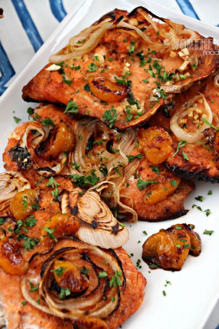 - Top salmon steaks with Mandarin oranges, chopped garlic, and onions.