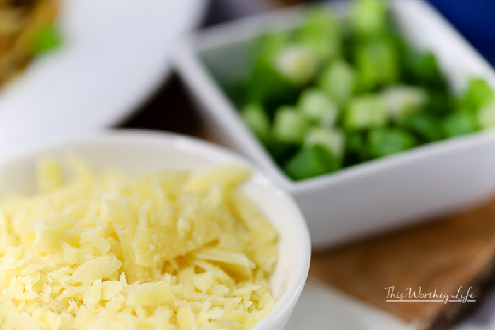 Preheat oven to 350°, prep the green onions and peppers in the morning or the night before will save time when you are preparing dinner.