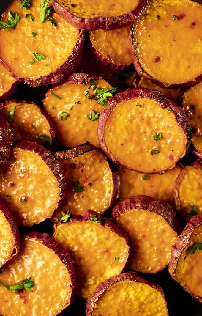 Baked Sweet Potato Slices with Harissa Honey Glaze