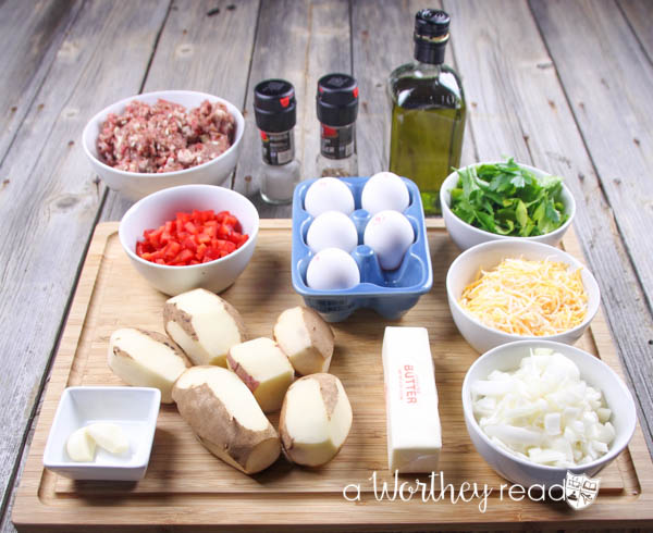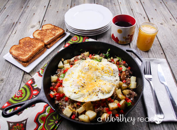 There is nothing wrong with having a light breakfast. A quick bite of fresh fruit or a healthy bowl of granola is typical around our house. But weekends we let the breakfast plates get a bit heavy laden. And making a nice hearty meal like our Beef & Potatoes Breakfast Skillet Casserole is not a bad plan of action. And this is breakfast with a substantial stick to your ribs factor. There a seasoned beef with chunks of garlic, Russet potatoes, onions, sweet red bell peppers, eggs, cheese and flat-leaf parsley. All of the ingredients come together to make any weekend memorable. Look for the full recipe down below.