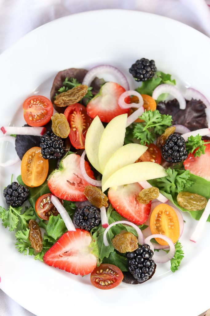 I also found a wonderful Basalmic fig vinegar, and it was the perfect key ingredient for a light salad dressing when mixed with a bit of Greek olive oil and freshly cracked black peppercorns. And if summer berries are your thing, then you are going to love all of the ripe, plump, and juicy blackberries and strawberries I added to the salad bowl. I also included tri-colored heirloom tomatoes, golden raisins, crisp golden delicious apples, and red onions. All of these super fresh ingredients made for one amazing and visually stunning salad.