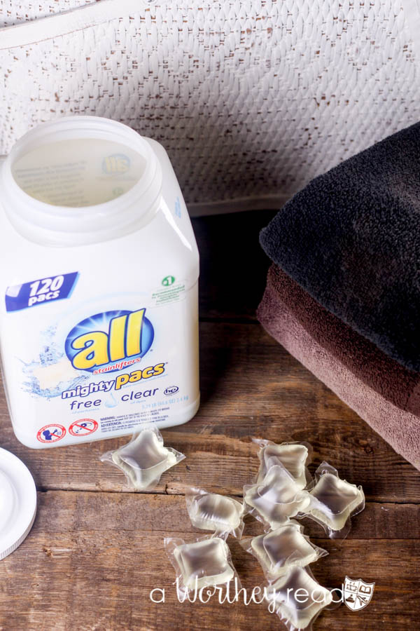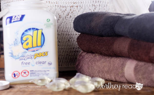 11. Use LESS Detergent. Using the all® free clear Mighty Pacs® makes your job a whole lot easier. Instead of measuring out how much detergent you need to use, you can just throw in a Mighty Pacs®, and you’re ready to go!
