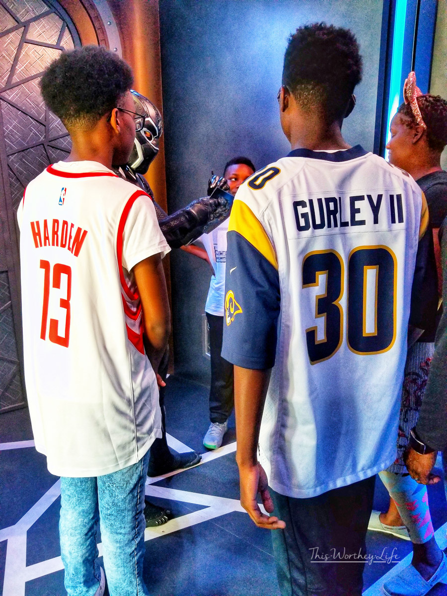 That’s a great time to get an individual photo with a Dora Milaje. Plus, she was funny. Two of our boys were sitting on the rails, and she told them to get down. They moved like their butts were on fire, Derrick and I stood there cracking up laughing. And she looked at Zayd’n and told him to behave. She could tell that he was something else.
