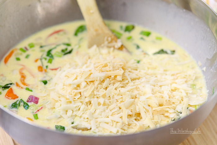 Tossing in two cups of cheese, one cup of grated Grana Padano, and a cup of grated Asiago, these are both intensely flavorful cheeses, and they both pair well with the eggs, bacon, and vegetables.