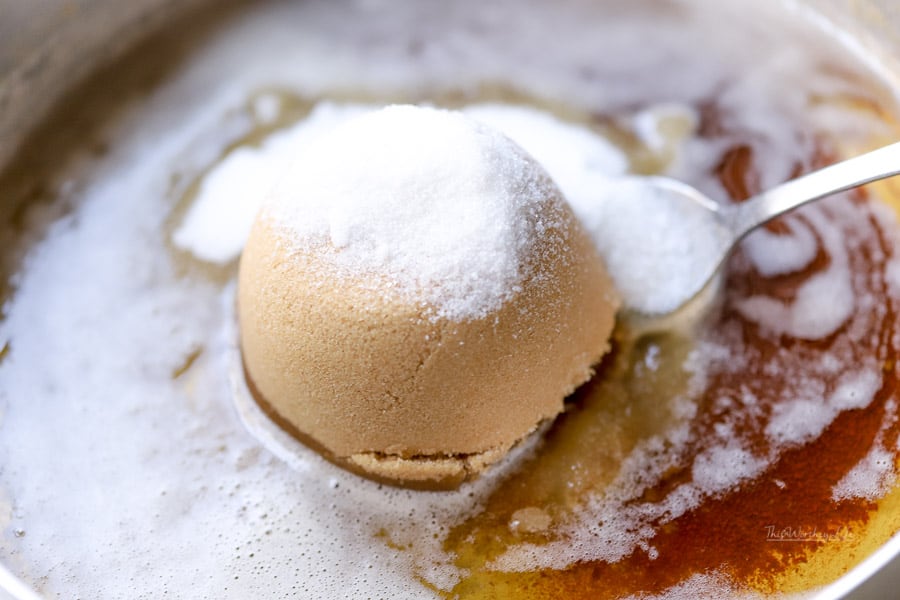 After the butter is browned, stir in the light brown sugar, granulated sugar, pure vanilla extract, and pecan liqueur. What you’ll get is an intensity of flavor that is unmatched.