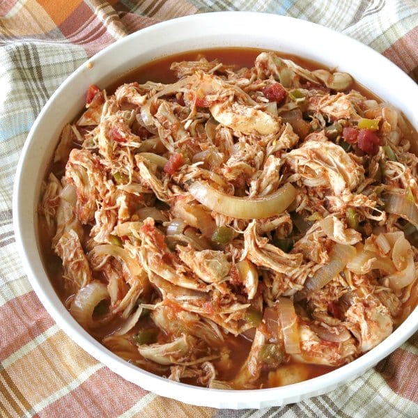 The chicken comes out juicy and tender. To create your tacos, use the chicken and top with your favorites, such as shredded cheese, sauce, tomatoes, onions, peppers, avocados, etc.