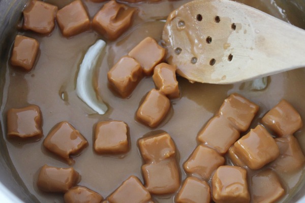 - Melt the caramels with milk over low heat until smooth, stirring constantly.
