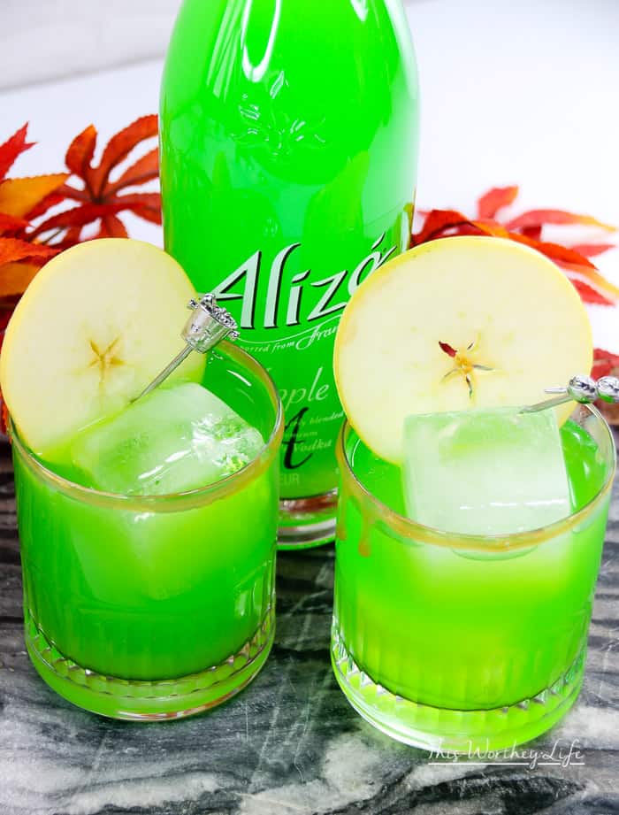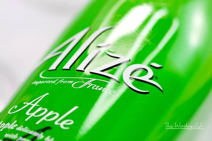 - Into a cocktail shaker add ice, vodka, and Alizé Apple Liqueur.