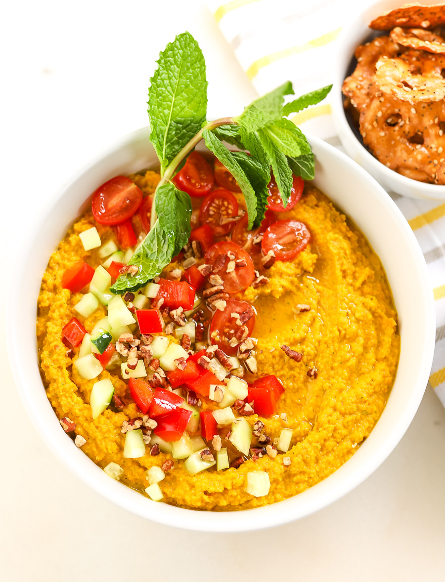 Our delicious carrot-based dip is dressed to impress, and by dressed, we mean with all of the fresh veggie toppings you can imagine. Plus a handful of chopped nuts just for fun. Make this wonderful dip just in time for the perfect appetizer for your Easter Sunday supper!