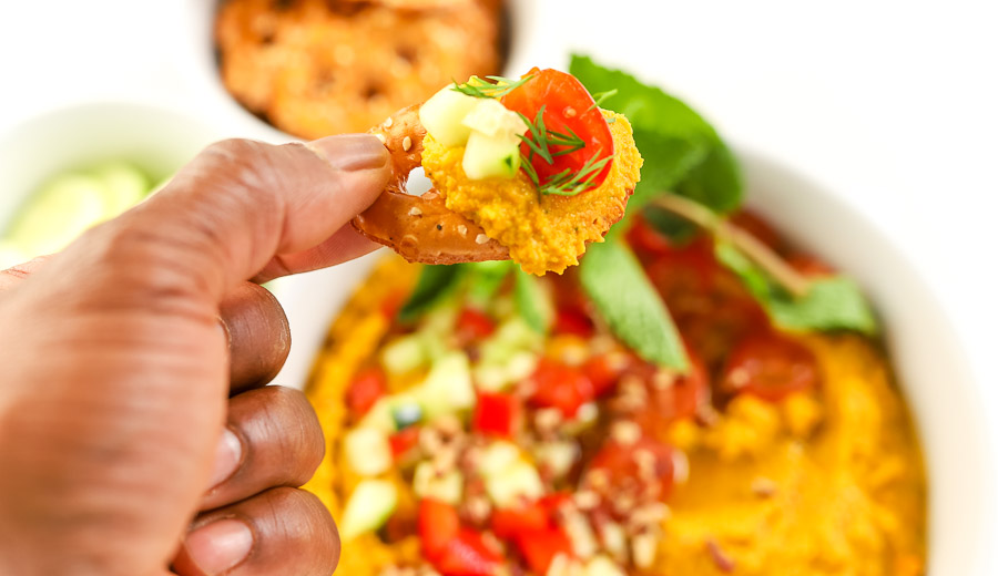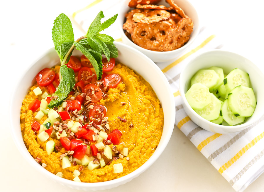 We served our delicious carrot and chickpea dip with fresh slices of cucumbers and savory Snack Factory Everything Bagel Pretzel Crackers. I can’t think of a better combination. So, if you want to try something new and different, this is a great dip to try!