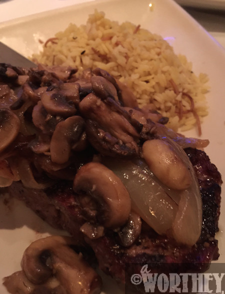 For dinner, I had a succulent 8-ounce Top Sirloin served with rice pilaf. This was a great steak—juicy and packed with lots of beef flavor. Afterwards, I was a very happy girl.