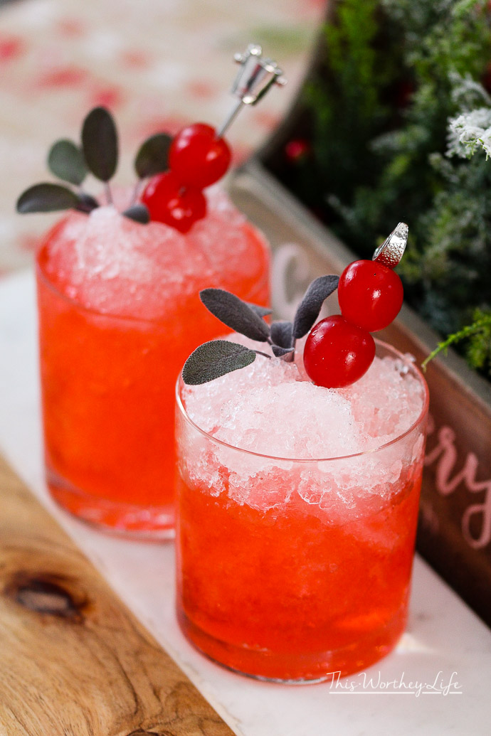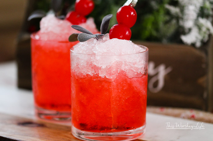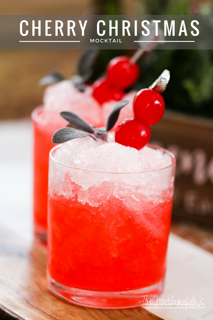 Get Christmas in a cup with our Cherry Christmas mocktail idea. Filled with cherry soda, peppermint syrup, and cherries, this frozen drink idea is a great drink idea for your holiday party.