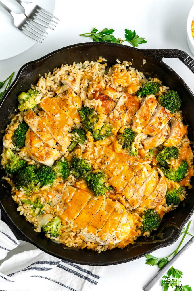 This cheesy chicken broccoli rice skillet meal is a one-pot dinner that is loaded with flavor.
