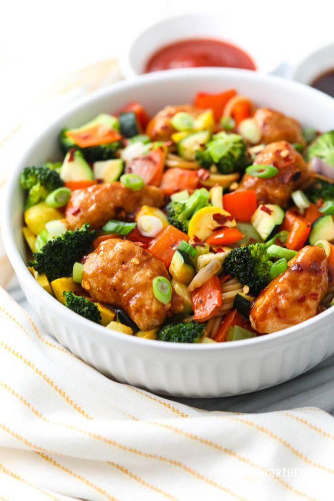 This is a super easy recipe with fresh vegetables and General Tso’s Chicken.