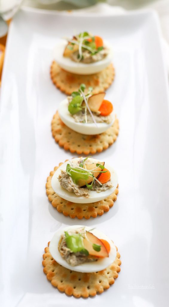 Optional: Place each deviled egg onto a cracker for an elevated look.