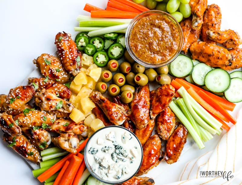 Our grazing board is pretty straight forward with three types of wings that you can prep the day before or the day of the game, give yourself time to prep all of the veggies and chicken, and you’ll be good to go. But you may want to make extras because once your guests get a taste, I’m pretty sure they’ll want more. And if you’re a fan of grazing board, be sure to check out our Supersized Grazing Board For Game Day.