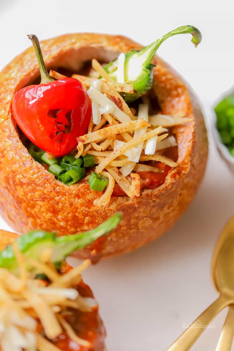 Comfort in a bowl is what we’re calling our Cheesy Chili Bread Bowl with Garlicky Fried Tortillas. Take your best chili recipe and give it an upgrade with our recipe down below!