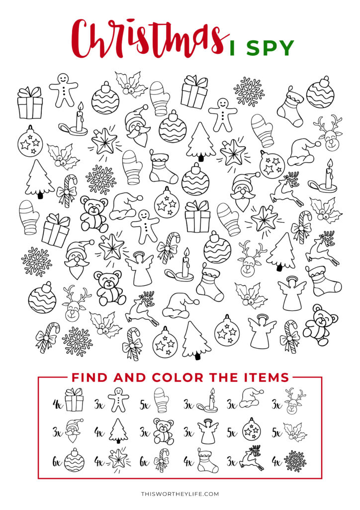 This is another great addition to your holiday routine. Print out this simple I-Spy Christmas printable and add it to your kid’s box of activities for the holiday season. Keep a copy in the car for when you have to wait somewhere and they get bored. You can also add it to the holiday table for them to do while waiting for Christmas dinner. Print it here: Free ISpy Christmas Printable