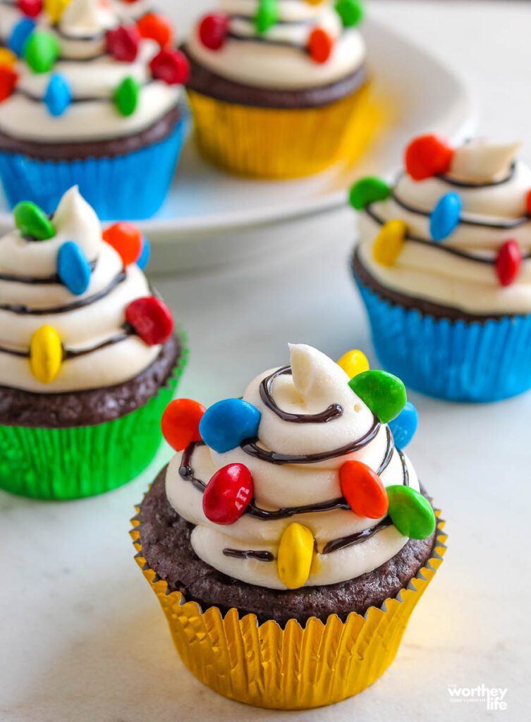 - Buy Christmas light sprinkles, and use that to place on the cupcakes for the holiday lights.