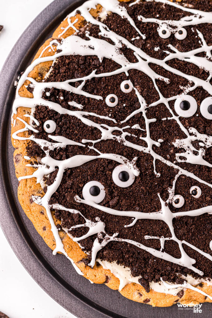 This spider cookie pizza Oreos recipe is a chocolate chip cookie topped with a rich cream cheese topping, crushed cookies, and candy eyes.