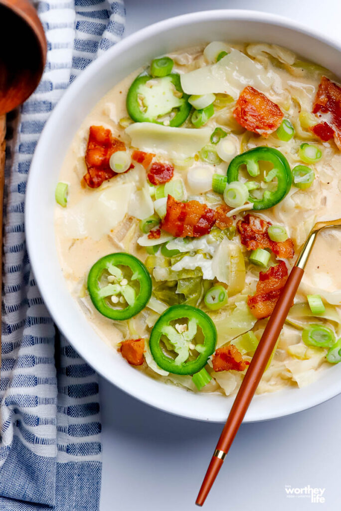 The caramelized onions add depth to this creamy cabbage with a bacon soup recipe.