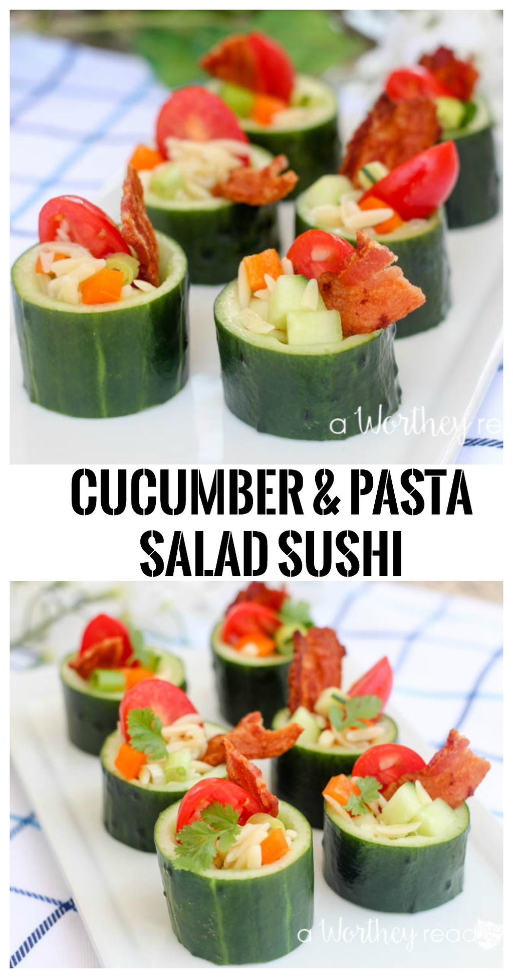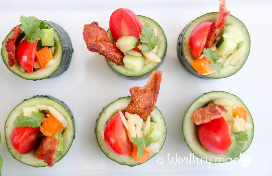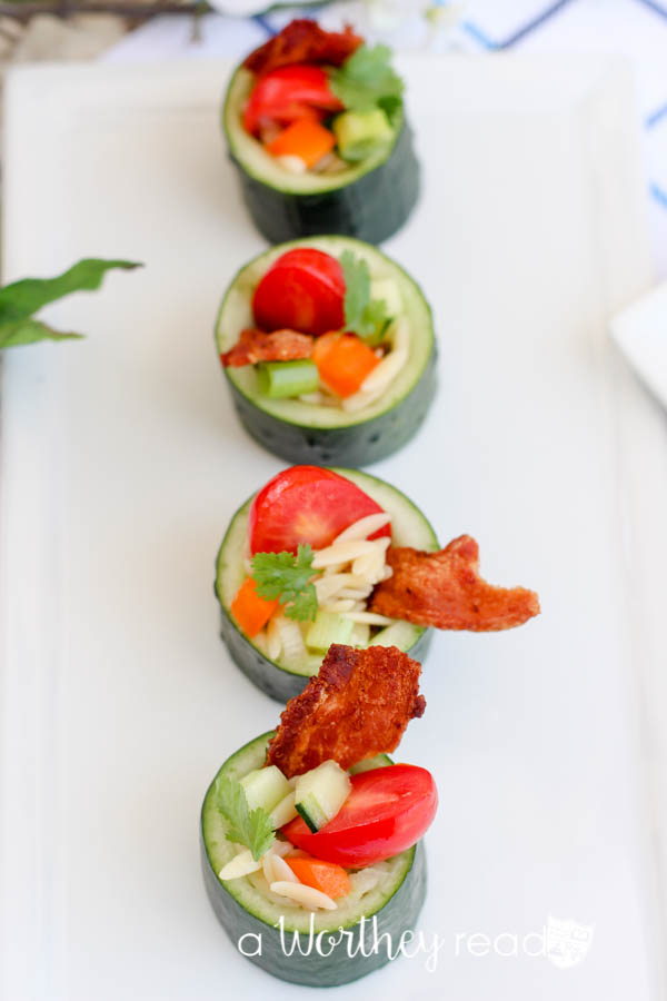 Our Cucumber & Pasta Salad Sushi was born out of boredom. It was! I was in the kitchen (imagine that) and as I was making a pasta salad with orzo pasta and veggies and I said out loud, “This is boring!” Now, this isn’t necessarily a 100% original idea, but it is close. Semi-close? Now, we have all seen the hollowed-out cucumber stuffed with seafood and such, but to date, I have never witnessed the prepared cucumber stuffed with orzo pasta salad or any pasta salad for that matter. Anyway that was my kinda eureka moment, close enough, right? This is a cool alternative way to serve up a pasta salad, and our boys (and the wife) ate them all up. Maybe it was the thick-cut bacon? Or maybe it was all of the fresh veggies, then again perhaps it was the blistered grape tomatoes? Whatever the reason, it is always nice to see your little ones eating something that is good for them. So, if Cucumber & Pasta Salad Sushi gets the job done then who am I to argue. Check out the full recipe right down there. What are some creative ways you are using to make otherwise unappealing food look appetizing to your picky eaters? We would love to hear your ideas. Leave a comment if you dare!
