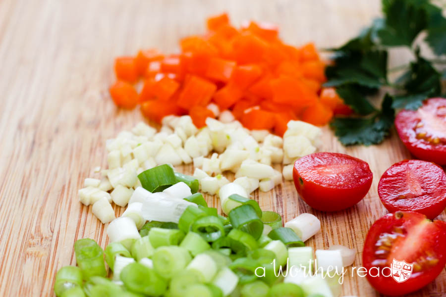 - Halve grape tomatoes slice green onions, minced garlic through a garlic press,