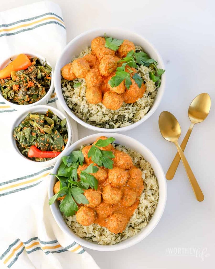 For this curry meatball recipe, there’s lots of spice, with curry, turmeric, coriander, and cumin leading the pack. I also added a few red pepper flakes and freshly cracked black peppercorns. I also love the fact that this is a dairy-free recipe which is good for a lot of reasons. The final result is an under an hour recipe that tastes just as good as it looks. Get the full recipe down below.