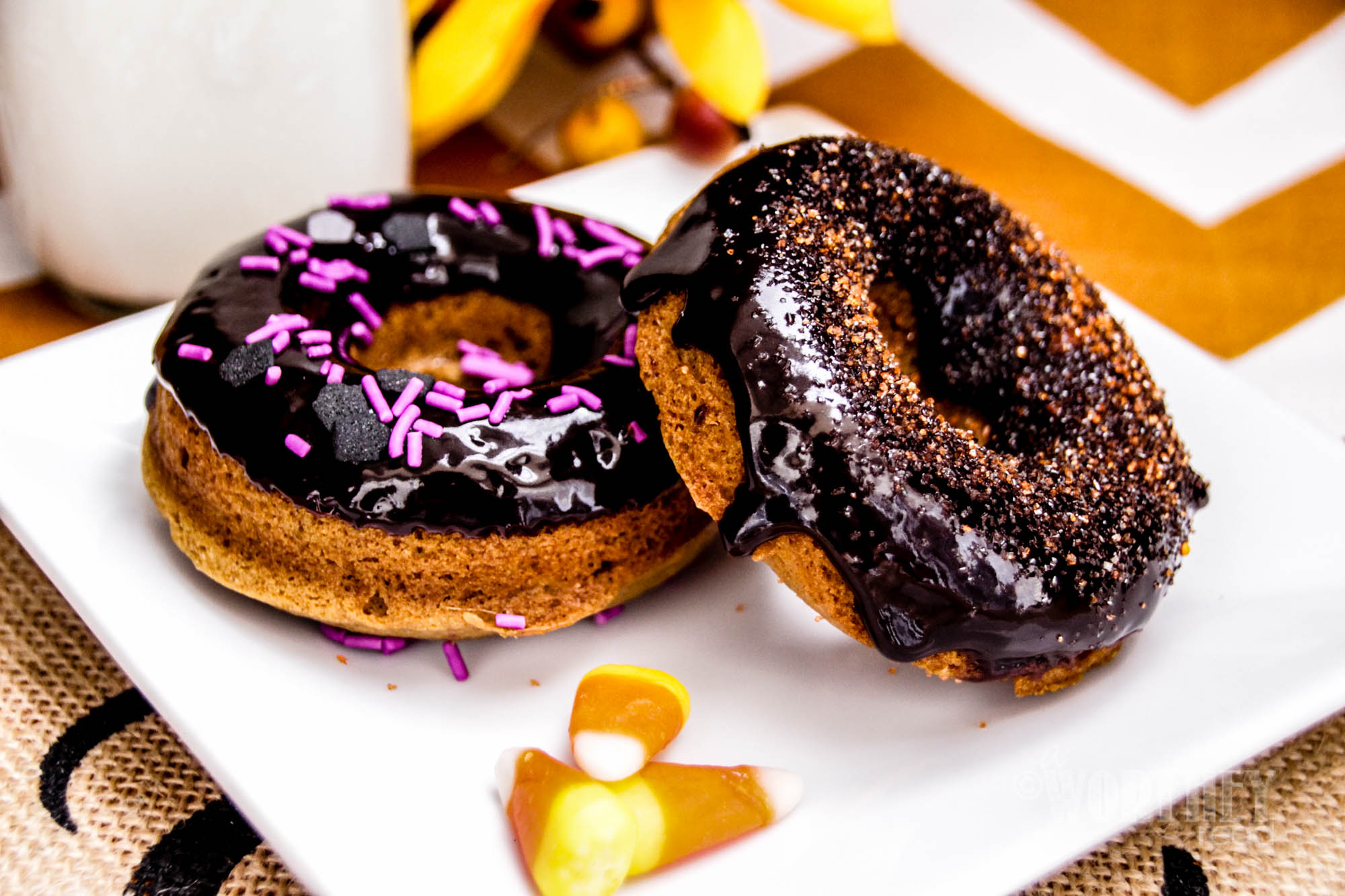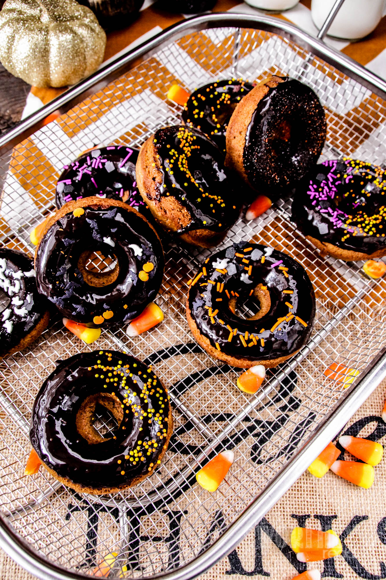 - Allow donuts to cool completely, then dip them in dark chocolate gaze and finish with an assortment of Halloween sprinkles.