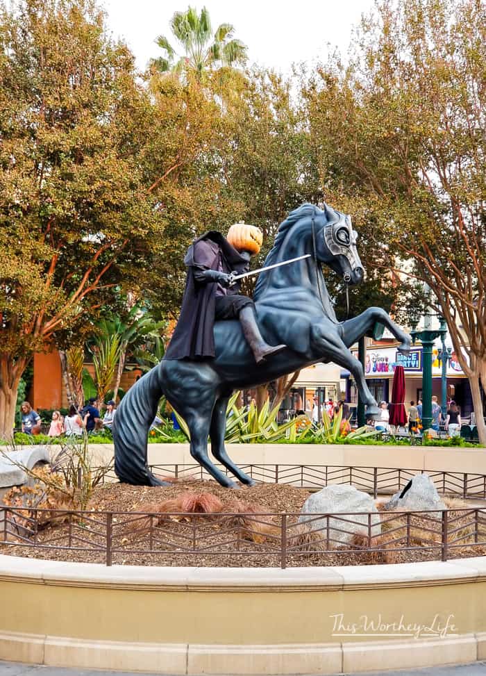 As you walk down Buena Vista Street, Halloween music is playing, and you will find Sleepy Hollow’s Headless Horseman to the left of the street.