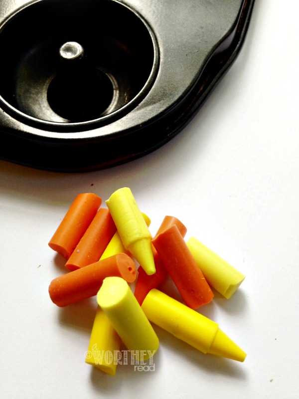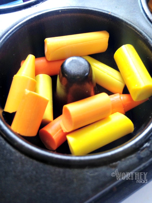 4. While the oven preheats, begin breaking your crayons up into smaller segments. You should be able to get about 4-5 segments per crayon stick.