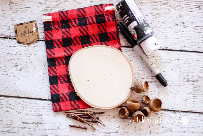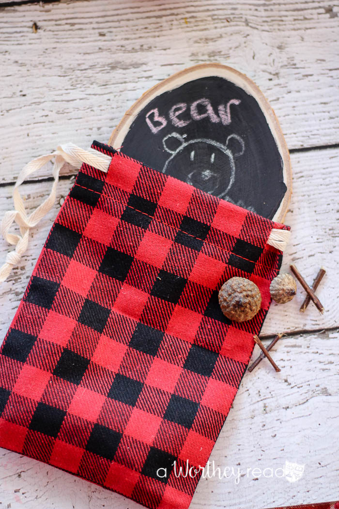 I love adding a homemade touch to Christmas by adding at least some homemade items to our gift list. This Rustic Game Pouch may be as much for the parents as it is for the kids, it is an excellent way to keep kids busy while waiting- for dinner at the restaurant, at Dr’s offices, or as a car game. I couldn’t resist the design of buffalo check so even though I wasn’t quite sure at the time how I was going to use it, as soon as I saw this little pouch it went in the cart. I grabbed mine at The Spot in Target, but you can sew one up pretty easy yourself if you can’t find one. The red and black buffalo check needed to be paired with some natural elements, and here’s how we put it together!