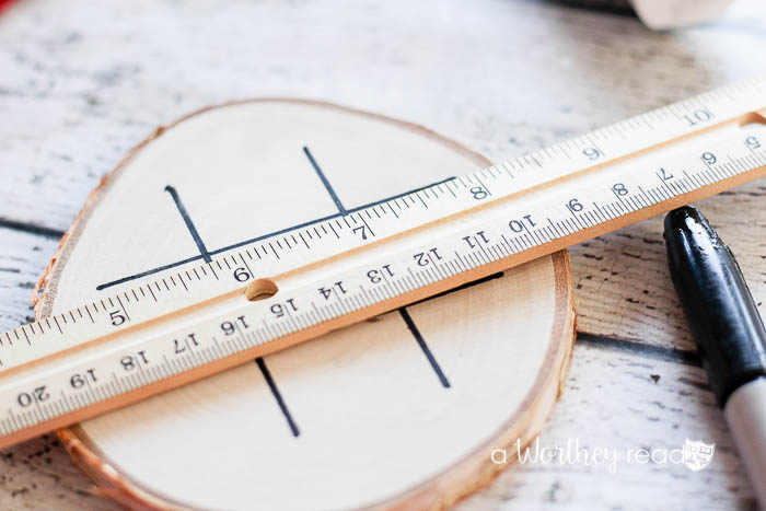 I started by drawing a tic tac toe board on one side, using a ruler and paint pen or a black sharpie. Make it as large as you can on the wood slice to give plenty of room.