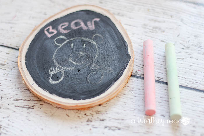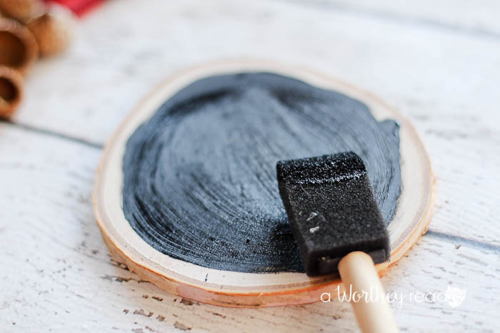 Next paint one side of the slice with chalkboard paint, I prefer to brush it on rather than spray paint so that it leaves a little of the natural wood showing. Allow your paint to dry completely.