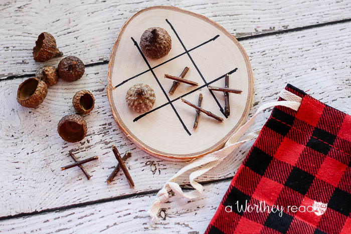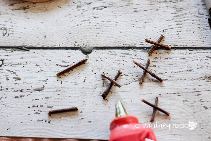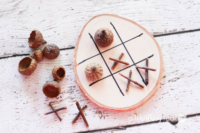 For your tic tac toe pieces, gather acorn tops and small twigs. I snapped my twigs into ¾” pieces and hot glued them into an X shape. You could also use small painted wood pieces, buttons, leaves, smooth pebbles, or other natural items.