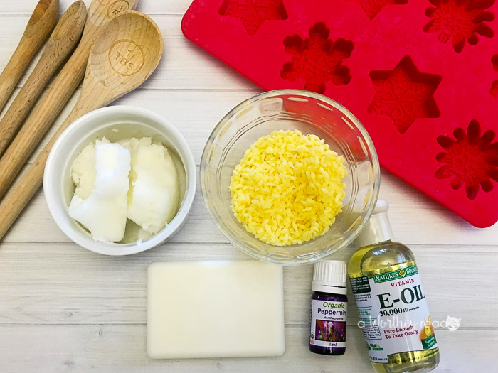 To make this simple but moisturizing lotion bar recipe, you just need a few simple ingredients. If you’ve made other homemade beauty products, you’ve likely already added these to your craft closet. If not, make sure to pick up this cute snowflake mold on Amazon. I love it since it is so cheap and easy to use. To make these extra special, you can buy some cute gel beads to place in the mold before you pour the lotion so it looks even more decorative for gifting.