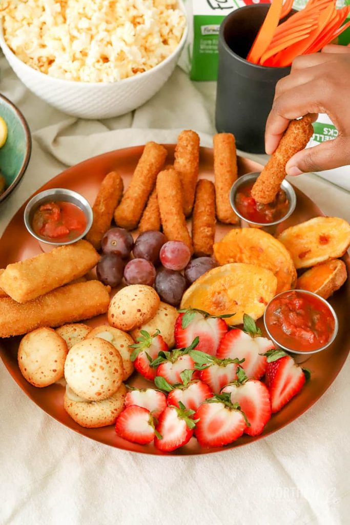 First, you can create a spread across a table; place food all around the table so guests (or kids) can access it from all sides. With Farm Rich products, you don’t need to add a lot of additional ingredient items, since they offer a variety of amazingly delicious premade appetizer ideas. I love that they are the perfect finger foods suited for both adults and kids, and are easy to grab and pop in your mouth. For the Farm Rich Homestyle Meatballs, I brushed them with a little honey and spicy barbecue sauce as soon as they came out of the oven. And I served the Mozzarella Sticks with marinara sauce. You can add your favorite dipping sauces and pair the delicious Farm Rich appetizers and snacks anyway you want to create your own custom-made game day spread. Be warned, TBH you may just forget about the game.