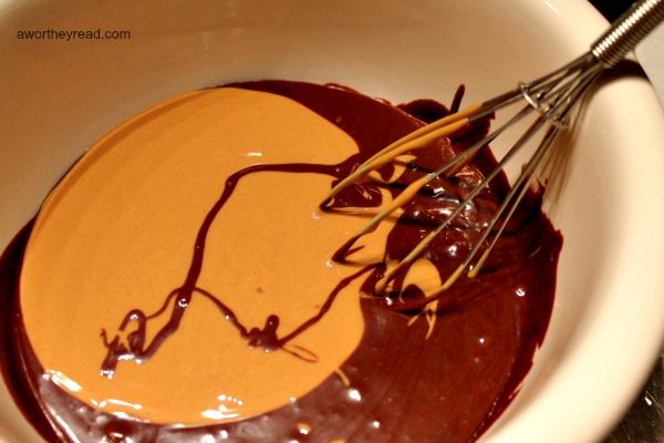 • Microwave peanut butter for 30-40 seconds until melted. Once both ingredients are melted, combine the two ingredients, leaving ¼ cup of peanut butter to the side.