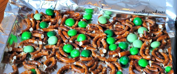- Spread ¾ cup of the Mint M&M’s and the broken pretzel pieces onto the lined cookie sheet.