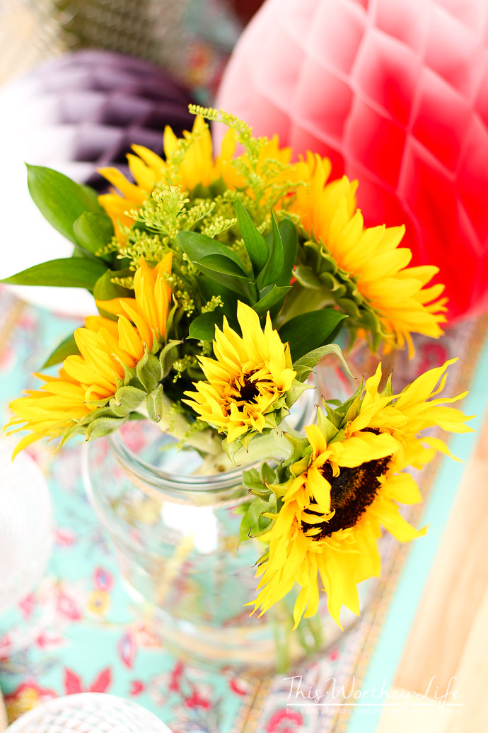 I picked up the sunflowers at my grocery store and popped them into a mason jar filled with water.